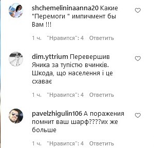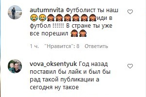 Но этот призыв вызвал негатив у многих фолловеров главы государства: «Володя, там с границей не слава Богу, а он шарфики меряет». «Точно проиграют. Если Зеленский сказал, то будет наоборот», «Пора б уже изменить эти пафосные кабинеты. Так как ты это обещал. И войну закончить. А то скоро тебя изменим!» «Да, победа! Снова полный локдаун, а вы, как хотите, живите… Такого еще ваш шарф увидит…», «А поражения помнит ваш шарф? Их же больше», «Футболист ты наш, иди уже в футбол. В стране ты уже все порешил».