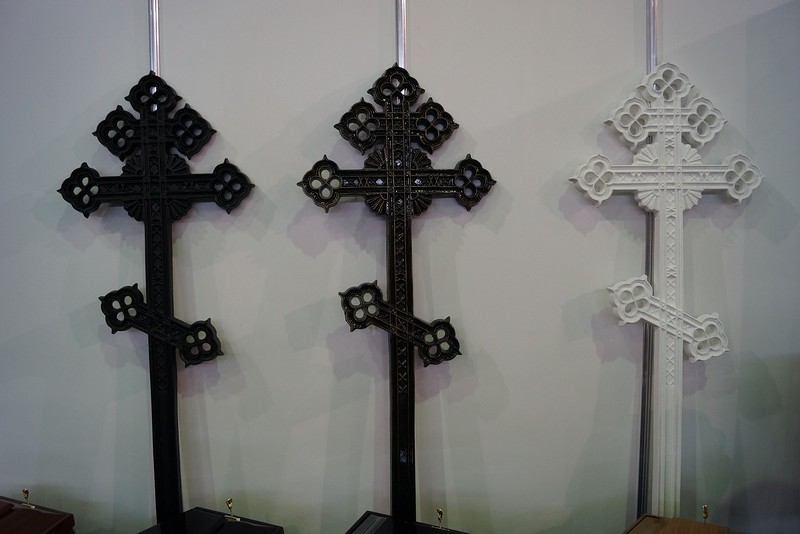 На стендах можно будет не только увидеть, но и купить лампады, литьё, венки, гробы всевозможных фактур и видов - от изделий из плотного картона до дорогих эксклюзивных моделей из ценных пород дерева, расписанные вручную под хохлому и гжель, станки для распила камня, все виды камнеобрабатывающих инструментов, косметические средства, урны для праха, термоклеевые пистолеты, принтеры для печати лент, цветники, надгробия, вазы, ритуальная одежда и обувь, литература.