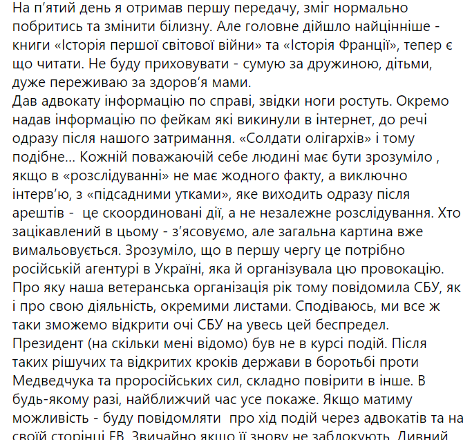 По его словам, сотрудники департамента досудебного следствия помнят "и Саакашвили, и Корбана, и многих других". Семенченко добавил, что ему передали книги по истории Первой мировой войны и Франции, а также про "набеги ботов" и блокировку его страницы в Facebook.