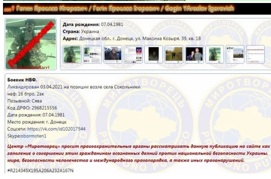 Сайт «Миротворец» сообщил о ликвидации третьего апреля на позиции террористов возле оккупированного села Сокольники (район трассы Бахмутка, напротив наших Крымского и Трехизбенки) боевика из шестнадцатого батальона территориальной обороны ЛНР Ярослава Гогина (позывной Сява).