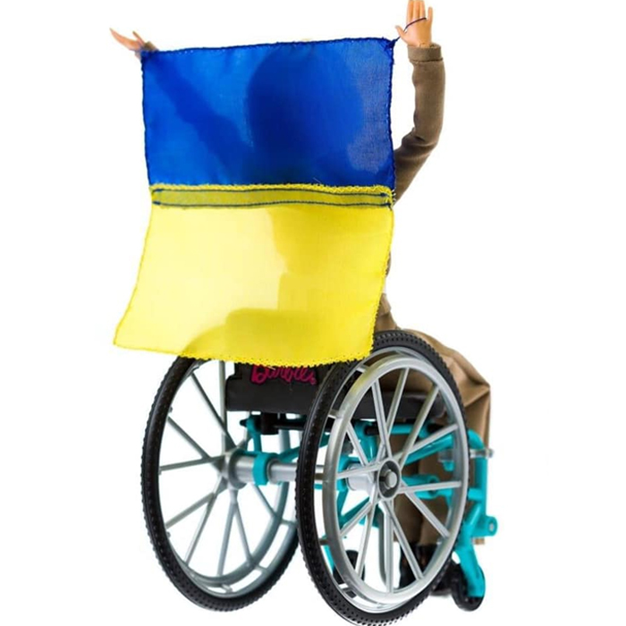 Кукла похожа на саму Яну и сидит в инвалидной коляске в наряде цвета хаки с имитацией государственных наград на груди. В руках она держит полотнище государственного флага Украины.