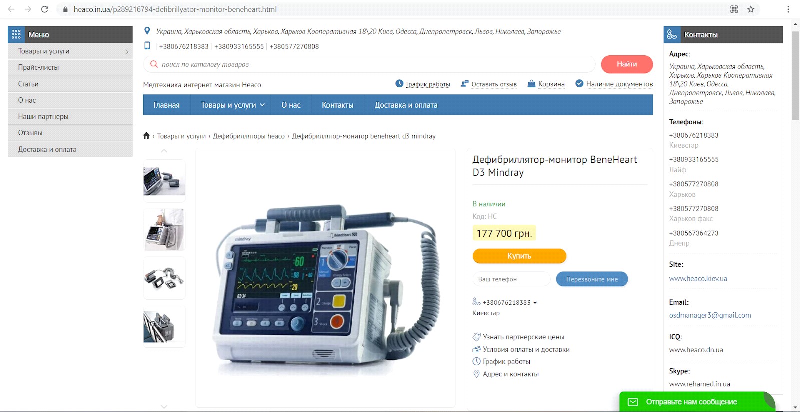 Интернет магазин медтехники Heaco предлагает (по состоянию на апрель 2021г) такой же дефибриллятор за 177.700 грн без НДС.