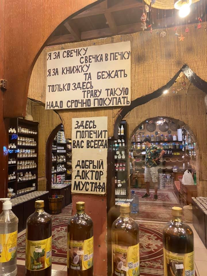 «Нет, ну я понимаю, что египтяне идут на любые ухищрения, чтобы заманить украинского туриста. Но почитайте эти „рекламные“ слоганы, сопровождающих копии укр торговых марок. Кто и в каком состоянии их составлял? Хотя последнее фото со стихотворением о траву все ставит на свои места!» — написала Романова.