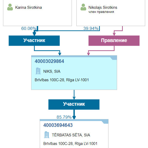 В свою очередь,"NIKS" (85.79%) и лично Николай Сироткин владеют фирмой «TĒRBATAS SĒTA» с уставным капиталом - 7 779 500 евро.