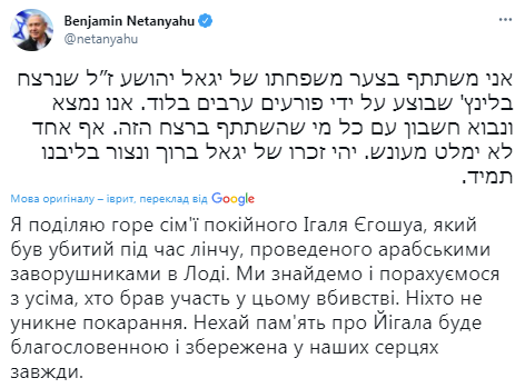 "Я разделяю горе семьи покойного Игала Иегошуа, убитого во время линчевания, устроенного арабскими мятежниками в Лоде. Мы найдем всех, кто участвовал в этом убийстве, и рассчитаемся с ними", – отреагировал на инцидент Нетаньяху. Он добавил, что "никто не избежит наказания".
