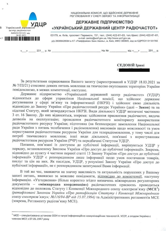 Со своей стороны Украинский государственный центр радиочастот (далее - УГЦР), отвечая на вопрос по информзапросу о том, вносились ли изменения в порядок частотных присвоений из-за военной агрессии, сообщает, что в настоящее время только Украина продолжает выполнять международные обязательства. "Согласование" (корректнее - международная координация) радиочастотных присвоений проводится в соответствии с Конвенцией Международного союза электросвязи (МСЭ). Это специализированное учреждение ООН в области информационно-коммуникационных технологий. Украина является членом МСЭ с 1947 года. Согласно уставу МСЭ, государства-члены организации не должны изменять характеристики своих станций или вводить в эксплуатацию новые, не получив согласия других государств-членов.