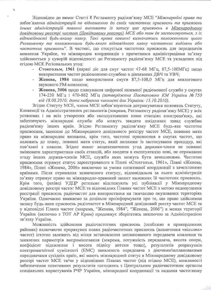 "Необходимо рассмотреть вопрос устранения ограничений мощности передатчиков на приграничных территориях, по крайней мере тех, которые граничат с Россией, Беларусью. Кроме того, УГЦР не должна согласовывать частотные присвоения с РФ в условиях войны, так как сейчас мы выполняем международные обязательства, а Россия - нет", - считает другой собеседник издания.