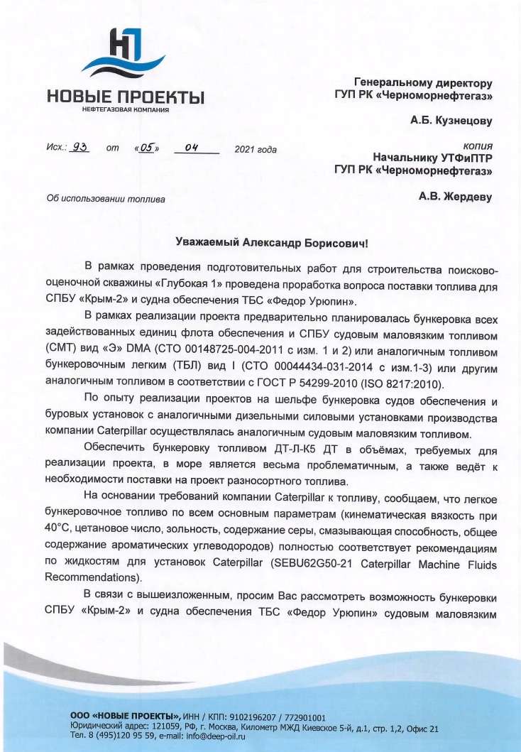 Во-вторых, нашлось письмо уже со знакомыми вам логотипом ООО «Новые проекты» и подписью директора Дорноступа к руководителю крымского «Черноморнефтегаза». Оно датировано 5 апреля 2021 года, когда происходят подготовительные работы для строительства поисково-оценочной скважины «Глубокая-1». В целом же речь шла о бункеровке топлива для СПБУ «Петр Годованец» («Крым-2») и судна обеспечения — буксира «Федор Урюпин», оснащенных силовыми установками компании Caterpillar, что требует высококачественного горючего, которое в подсанкционный Крым западные компании не поставят.