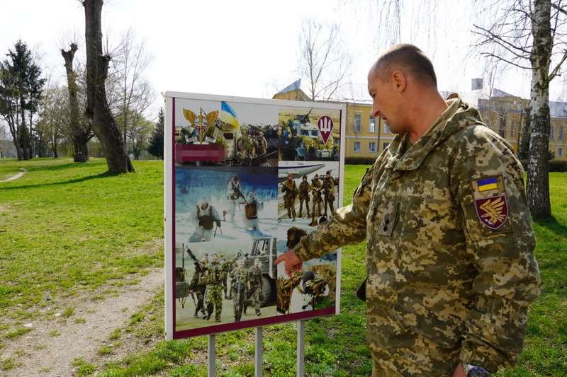 Леонід Карпенко показує на стенді у військовій частині фото з боїв у 2014 році та навчань ще до вторгнення РФ на Донбас. Фото: Людмила Кліщук, “Новинарня“