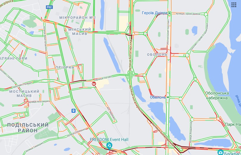 Крім того, затори спостерігаються на Набережному шосе, Набережно-Хрещатицькій, Набережно-Рибальській, проспекті Степана Бандери. На мостах поки проїзд не ускладнено.