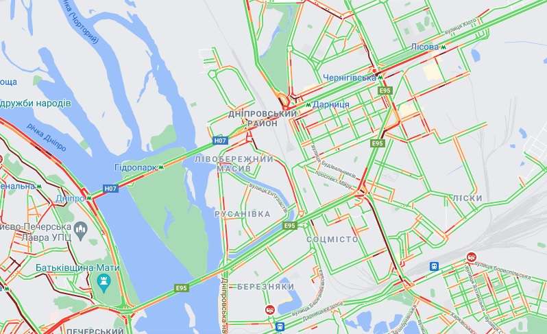 На лівому березі затори в районі метро “Харківська” по проспекту Миколи Бажана. Крім того – по проспекту Петра Григоренка, вулиці Анни Ахматової, на Харківському шосе, а також по бульвару Перова та Броварському проспекту.