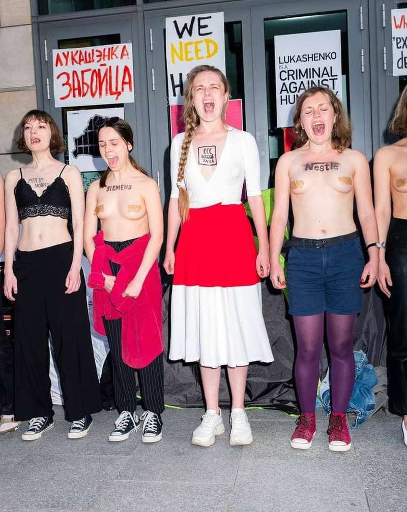 Часть участниц акции были топлес, все они написали на груди логотипы компаний, требования к которым выдвинули эти женщины. В частности, от Ikea активистки потребовали прекратить покупать белорусский лес, от Michelin - прекратить поставки в БелАЗ, МТЗ, БМЗ, от Philip Morris - расторгнуть контракты с Гродненской табачной фабрикой, от Siemens - прекратить деловые отношения с госструктурами Беларуси, от Nestlе - прекратить инвестировать средства в национальное белорусское телевидение.