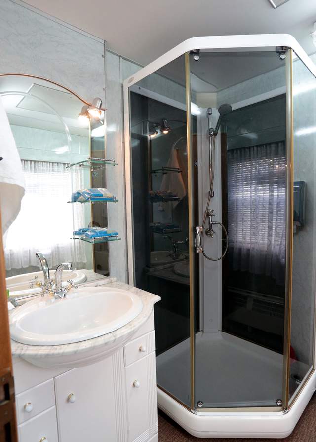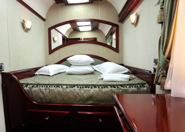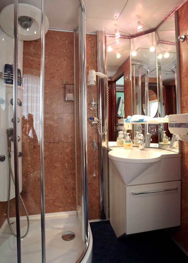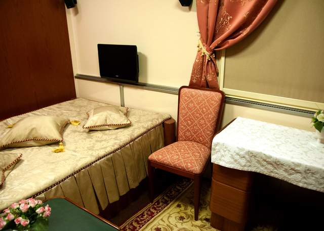 В спальном купе, кроме кровати, есть также письменный стол, шкаф для вещей и кондиционер. Кроме этого, для пассажиров обустроили и ванную комнату.