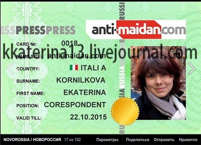 Екатерина Корнилкова, очевидно, проявляет такую любовь к «Новороссии» не просто так, а по напутствию главы итальянского представительства «Росссотрудничества» Олега Осипова, с которым она непосредственно знакома и принимает участие в мероприятиях, которые организует его контора.