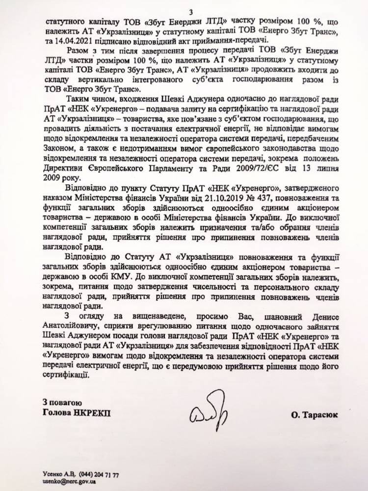 Вхождение Шевки Аджувера одновременно в наблюдательный совет НЭК «Укрэнерго» — который обратился с запросом на сертификацию, и наблюдательного совета АО «Укрзализныця» — которая связана с субъектом хозяйствования, который занимается деятельностью по поставке электроэнергии, нарушает требования относительно независимости оператора системы передачи.