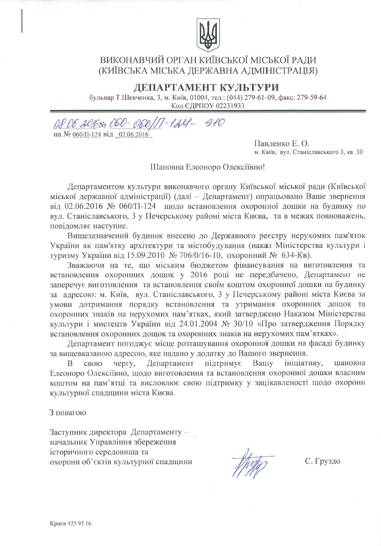 «Как результат – Печерское управление полиции ГУ НПУ в Киеве открыло криминальное производство № 12017100060000984, а департамент культуры Киевской городской администрации поддержал инициативу Элеоноры Алекссевны, которая профинансировала изготовление и установку на фасаде дома новой охранной таблички», подчеркнул глава «Национального антикоррупционного союза».