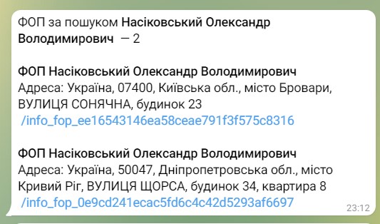 Двигаемся дальше. У Александра Насиковского есть два ФОПа. Один в Броварах, второй – в Кривом Роге.