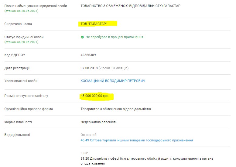 1. ТОВ "ГАЛАСТАР" – статусный капитал в 45 миллионов. Бенефициар – Насиковский.