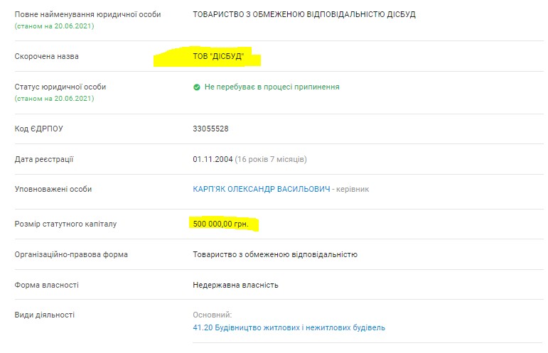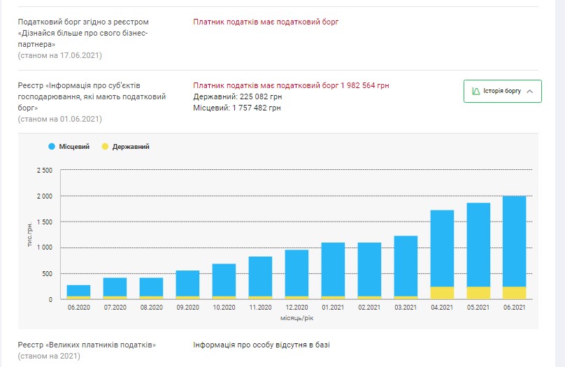 2. ТОВ "ДІСБУД" – компания со статусным капиталом в 500 000 гривен имеет налоговый долг, который продолжает уверенно расти. Конечный бенефициар – Александр Насиковский. Также компания проходит по 17 судебным делам.