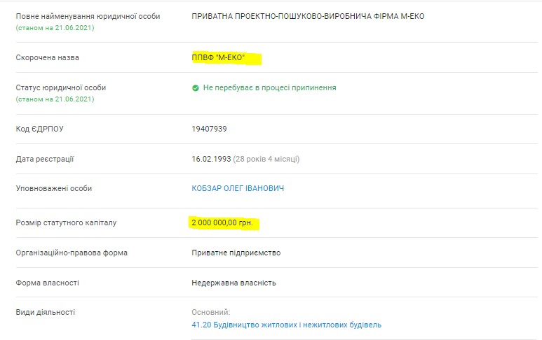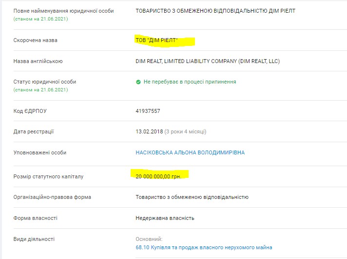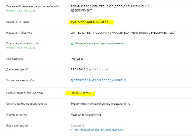 13. ТОВ "ЮННА ДЕВЕЛОПМЕНТ" – открытое акционерное общество со статусным капиталом в 200 000 грн. Конечный бенефициар – Насиковский.