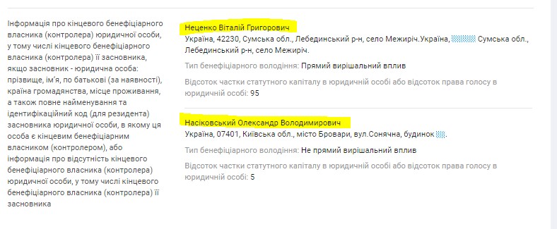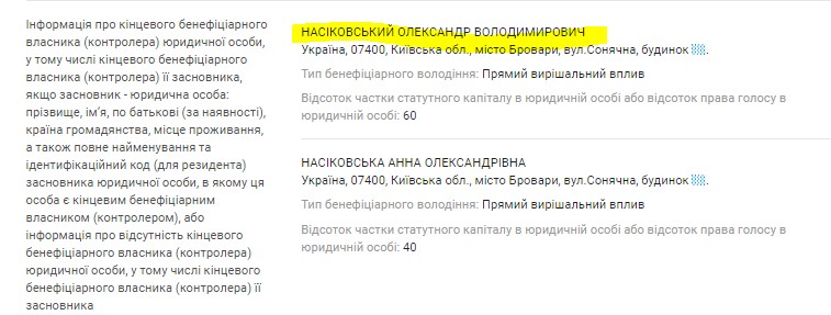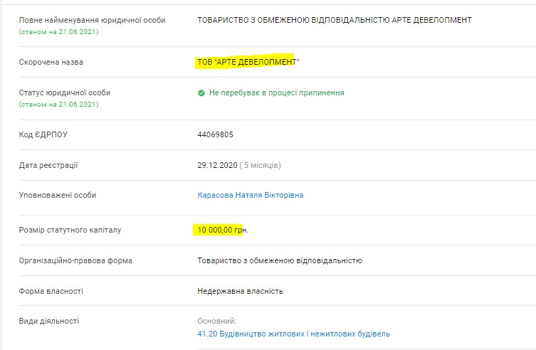 7. ТОВ "АРТЕ ДЕВЕЛОПМЕНТ" – первоначальный капитал составляет 10 тысяч гривен. Конечный бенефициар – Насиковский.