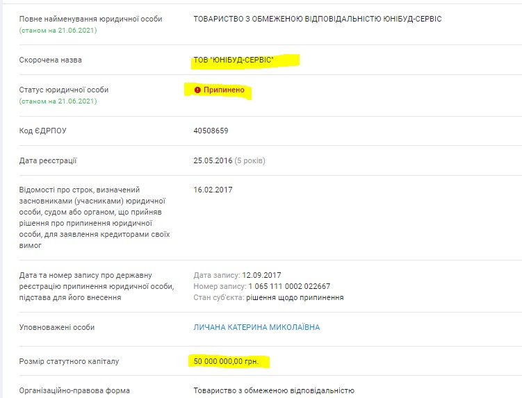 8. ТОВ "ЮНІБУД-СЕРВІС" – компания со статусным капиталом в 50 миллионов ликвидирована. Кто был бенефициаром, вы догадались.