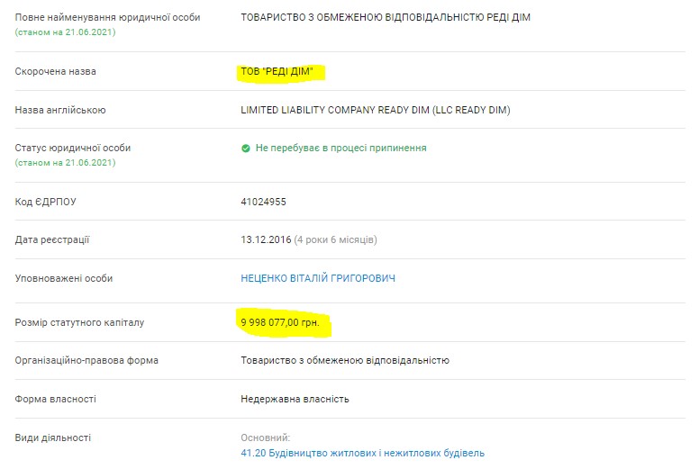 10. ТОВ "РЕДІ ДІМ" – статусный капитал составляет почти 10 миллионов. А здесь главный бенецифиар – Неценко Валерий (95%), а у Александра Насиковского только 5 %.