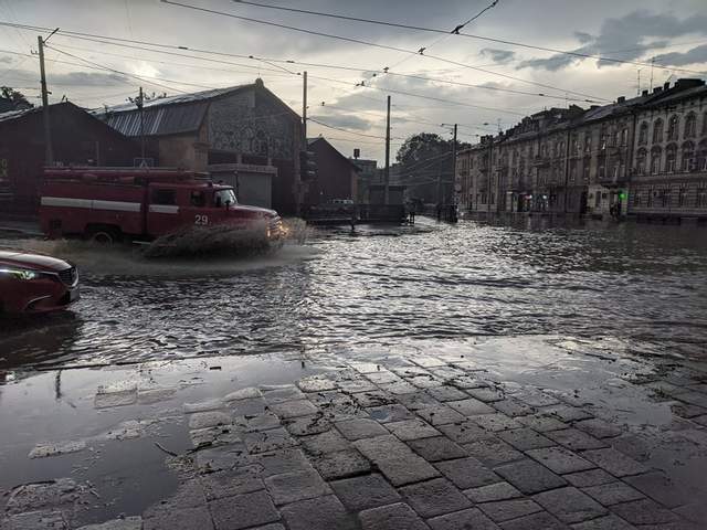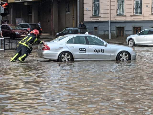 Улицу сильно затопило, обойти воду невозможно. Автомобили пытаются проехать, однако не всем это удается. В частности, в воде застряла машина службы такси Opti. Спасатели были вынуждены толкать ее.