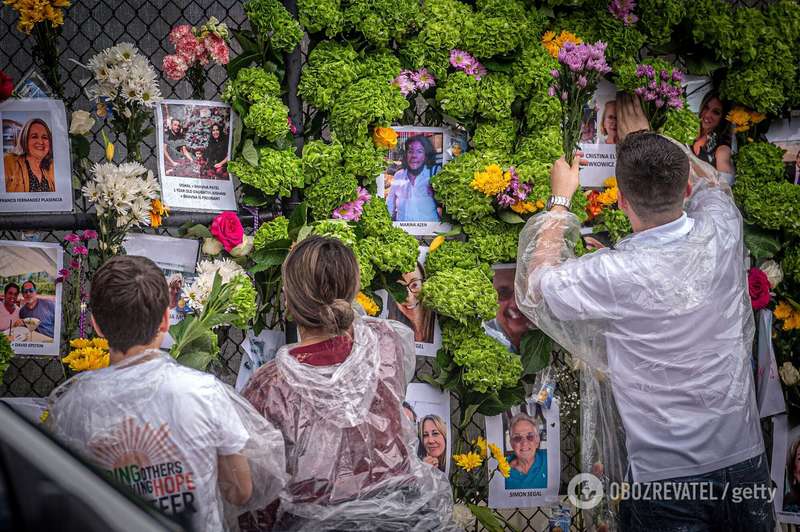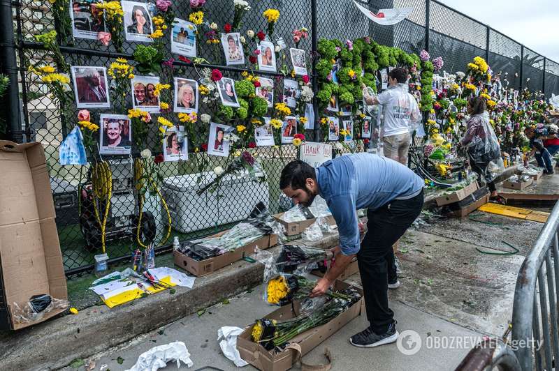 Фотографии пропавших без вести были вывешены на ближайшем ограждении вместе с цветами и посланиями. "Господь – убежище мое", гласит сделанный вручную знак. "С тобой Бог, Серфсайда", – написано на другом.