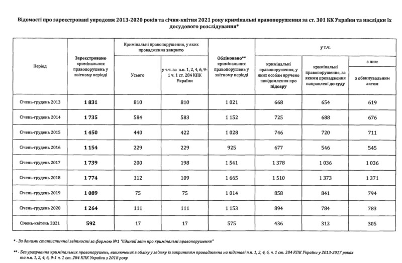 Водночас статистика показує, що кількість проваджень за 301-ю статтею не зменшилась: щороку вона сягає понад тисячу.
