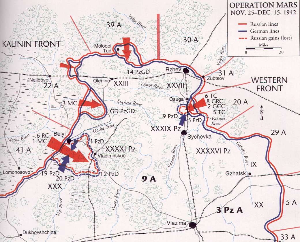 Замысел советской операции Марс появился в конце сентября 1942 года как продолжение первой Ржевско-Сычевской операции (30 июля - 30 сентября). Его задача - разгромить 9-ю немецкую армию, составлявшую основу группы армий Центр, в районе Ржев, Сычёвка, Оленино, Белый.