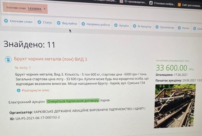 Харьковский авиационный завод (ХГАПП), который уже который год находится в состоянии банкротства, внезапно начал продавать металлолом на ProZorro по стоимости лота ниже рыночной цены. Но завод – не пункт сбора лома черных металлов. Все говорит о том, что под видом металлолома под резаки позже пойдет и его оборудование.