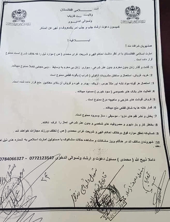 Указ о запретах на территории Эмирата, вывешен запрещенной в России организацией «Талибан» 7 июля в провинции Балх, недалеко от провинциального центра Мазари-Шариф