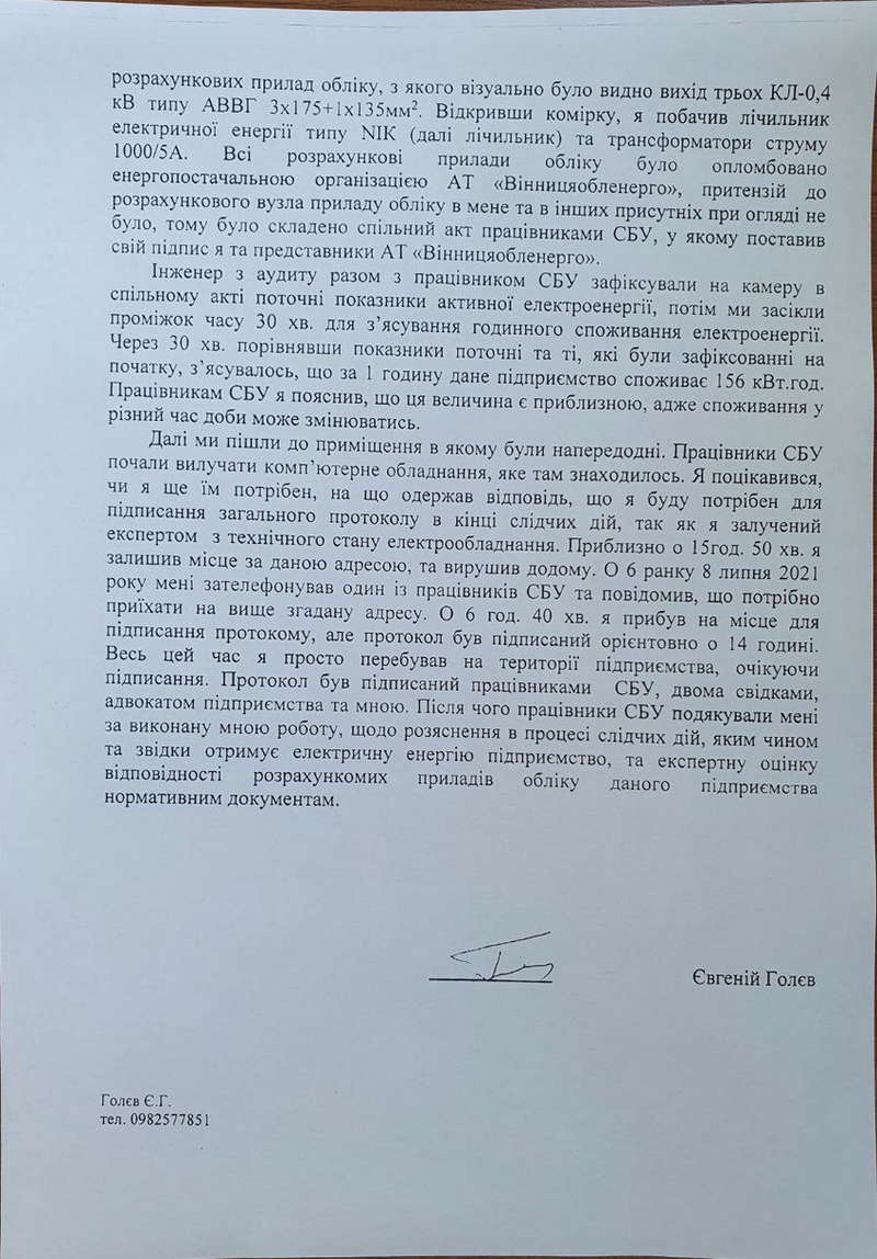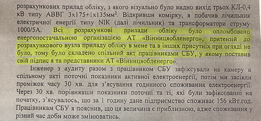 Щодо твердження про масштабну крадіжку електроенергії. Участь в обшуку брали і працівники Держенергонагляду – державної структури, яка не підпорядковується приватному АТ «Вінницяобленерго». Саме фахівці Держенергонагляду дали висновок, що ніякої крадіжки електроенергії не було.