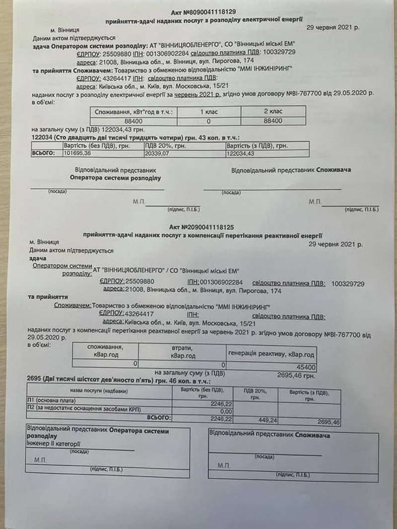Окрім того, у відповідь на запит ТОВ «ЕНЕРА Вінниця», повідомила, що має договори на постачання електроенергії як з ТОВ «Альфа-Енерджі», так і з ТОВ «ММІ Інжинірінг». Відповідь була однозначною: рахунки за електроенергію сплачуються вчасно, заборгованість відсутня. Також активісти опублікували в соцмережі фото платіжок, які засвідчують, що за «вкрадену» електроенергію лише за минулий місяць було сплачено понад 300 тис грн.
