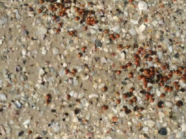 На видео видно, что мертвыми божьими коровками покрыт весь берег.