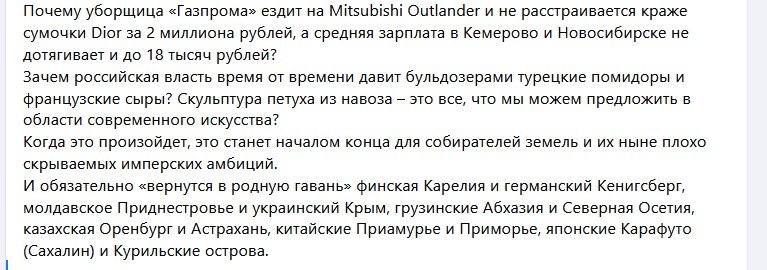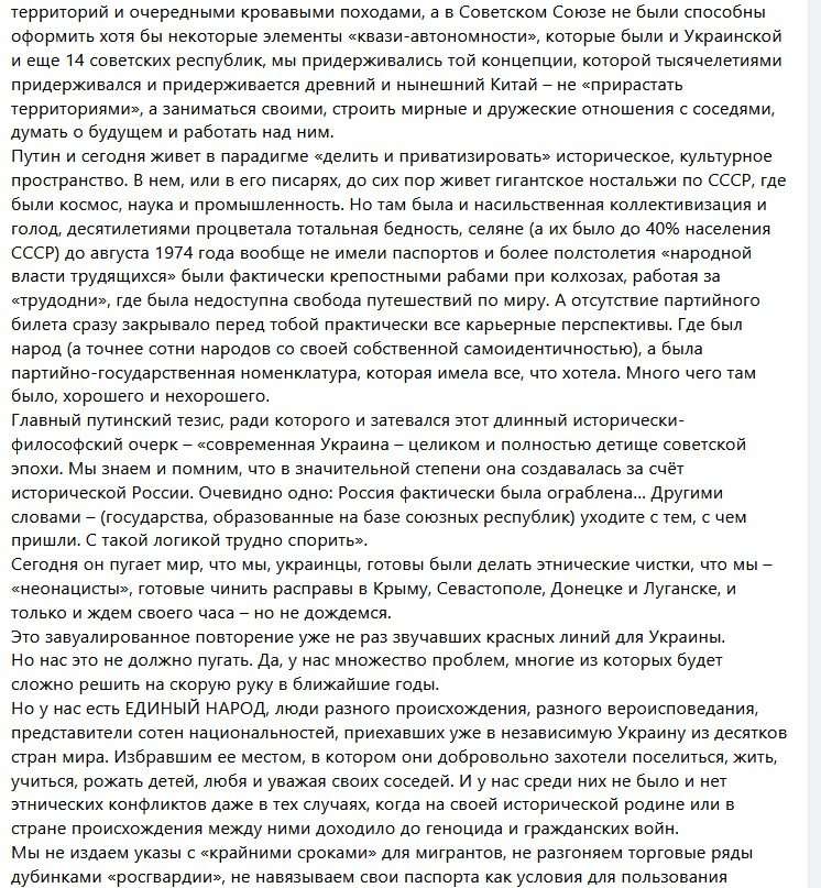 Журналистка в своем посте проанализировала тезисы Путина, которые назвала махровой пропагандой с большим количеством недостоверной и ложной информации. По словам Крюковой, Украина имеет исторический шанс на развитие, помешать которому может агрессивная политика российских властей, направленная на оккупацию Украины.