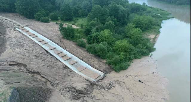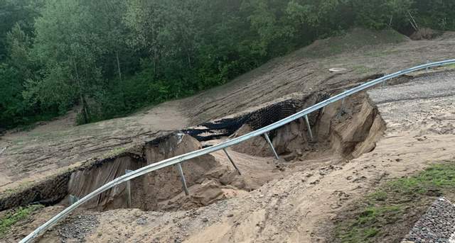 Только через полчаса после начала дождя мост поломался. Под поврежденным сооружением вода вымыла пласты земли под ограждениями и на склонах вдоль дороги.