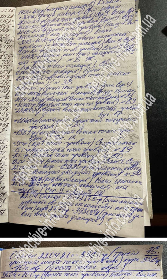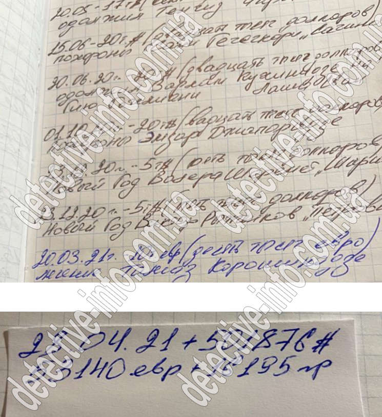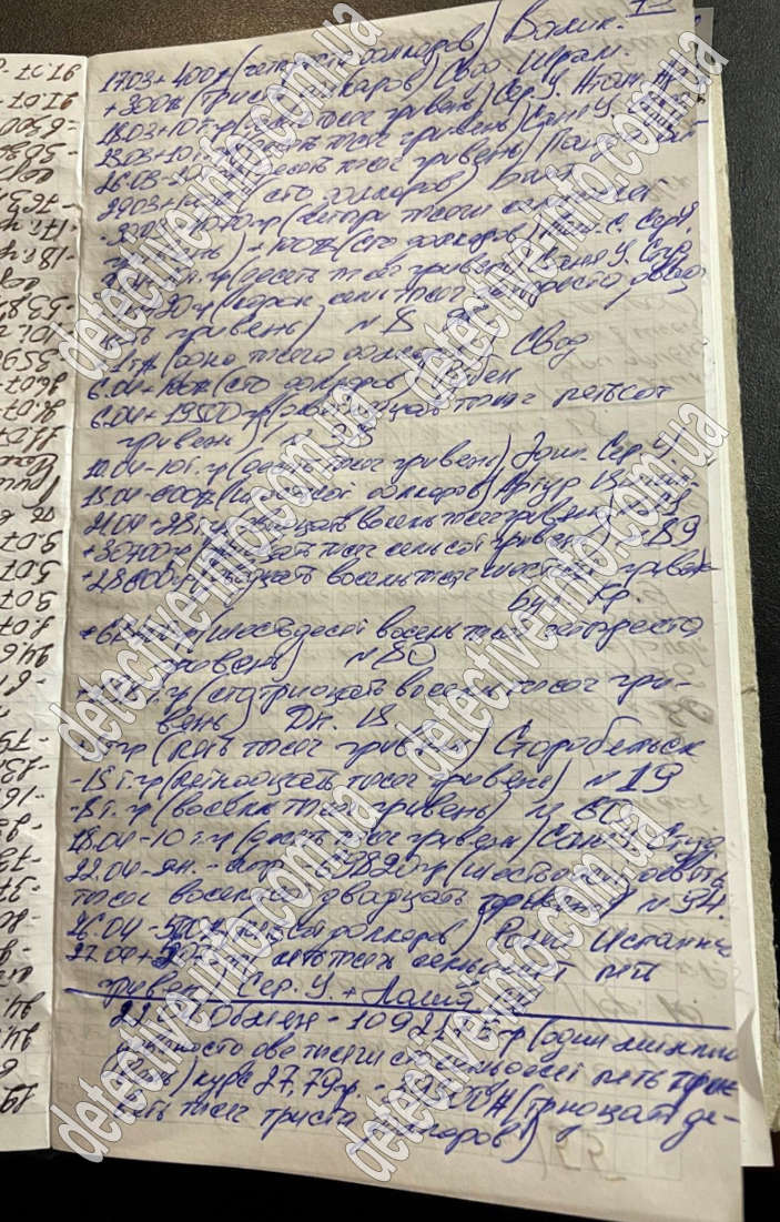 На відповідних фото, що опинилися в розпорядженні Dетектив-Info, позначені числові та буквені нотатки, що напевно могли відібражати рух грошових надходжень та видатків до так званого "злодійського общаку".