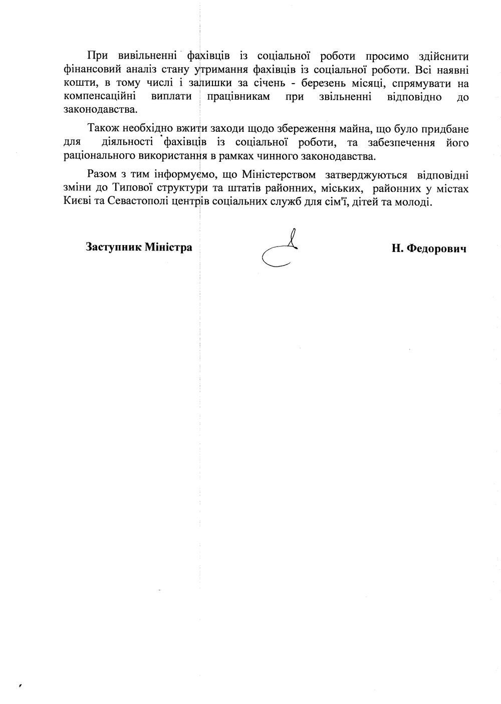 У зв’язку, з цим просимо не допустити скорочення фахівців з соціальної роботи в громадах, зберегти систему соціального захисту населення, розробити заходи щодо забезпечення неухильного дотримання прав і свобод людини, визначених Конституцією України.»