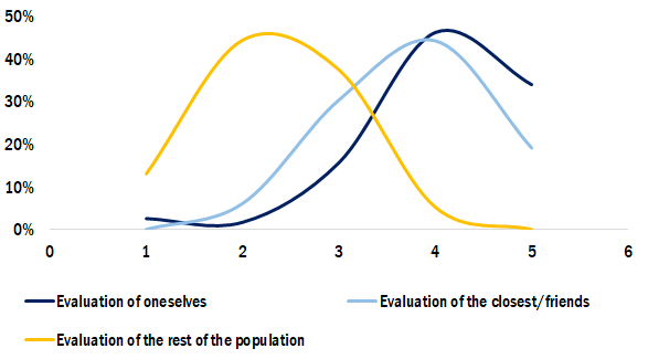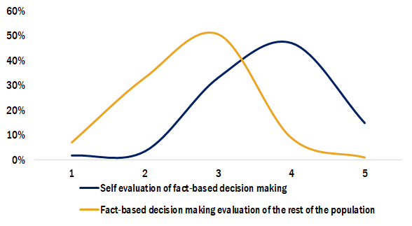 Перше спостереження стосується оцінки людьми власної обізнаності порівняно з рештою населення країни. Майже всі респонденти оцінюють власне знання фактів на порядок вище, ніж раціональність решти жителів країни (рис. 2). Тоді як середнє значення особистої обізнаності становить 4 за шкалою від 1 до 5, де 5 – це найбільший рівень обізнаності, відповідне середнє значення для решти суспільства трохи менше трьох. Поведінкова економіка пояснює це явище ефектом наївного реалізму чи ефектом «третьої особи». Відповідно до цих упереджень, людині властиво переоцінювати вплив, який інформаційні повідомлення мають на інших порівняно з нею. Простими словами, нам здається, що ми «найрозумніші в цій кімнаті». Люди впевнені, що бачать світ об’єктивно, тоді як інші, особливо ті, хто з ними не погоджується, є непоінформованими чи нераціональними.