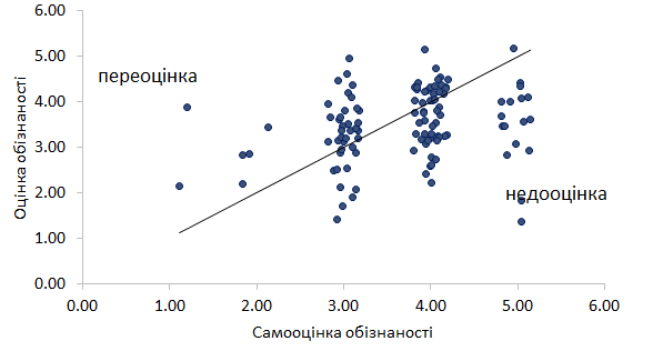 Рисунок 4. Самооцінка обізнаності про коронавірус (горизонтальна вісь) та оцінка обізнаності заснована на відповідях респондента про “коронавірусні” факти