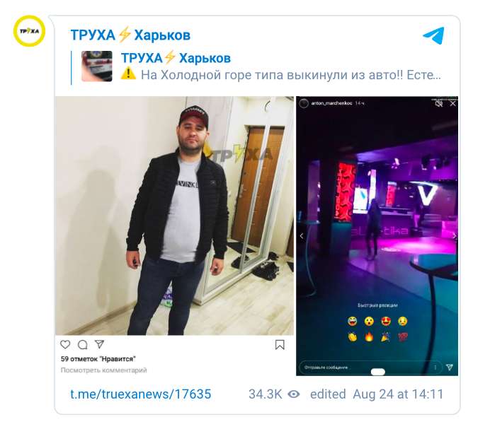 Соответствующее объявление разместили Telegram-каналах. Через некоторое время один из читателей сообщил, что человек на фото похож на его знакомого по имени Антон Марченко. У Антона в Instagram действительно есть фотографии похожего на пострадавшего мужчины. В его сториз видно, что ночью он находился в ночном клубе “Галактика”.