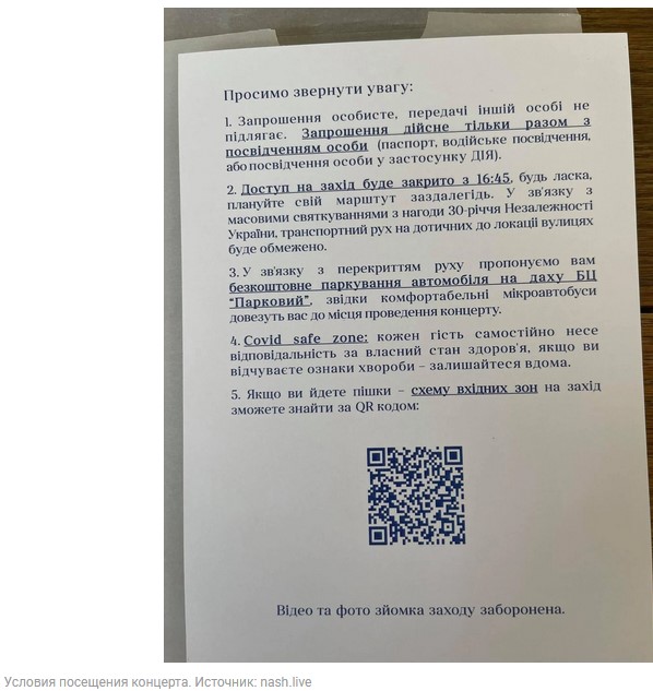 Люди пришли из-за того, что думали, что вход свободный, но охранники им сказали, что выступление можно посмотреть только по специальным приглашениям, а съемки – запрещены. Об этом сообщает телеканал "НАШ".
