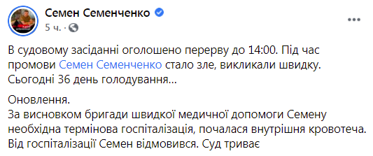 Это произошло на заседании в четверг, 2 сентября, сообщается на Facebook-странице подозреваемого. Уже больше месяца назад Семенченко заявил, что начал голодовку. Инцидент со скорой случился на 36 день его протеста.