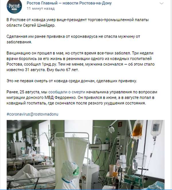 «В Ростове от ковида умер вице-президент торгово-промышленной палаты области Сергей Шнейдер.Сделанная им ранее прививка от коронавируса не спасла мужчину от заболевания.