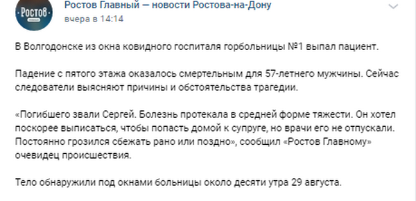 «В Волгодонске из окна ковидного госпиталя горбольницы №1 выпал пациент.
