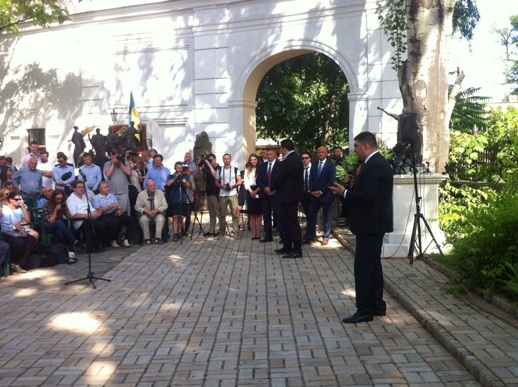 Признаюсь, меня не покидало ощущение, что председатель ОГА больше похож на американского пастора, ведущего богослужение. Еще секунда и хор, стоящий позади духовного лидера, должен был запеть. Но, конечно, эта иллюзия быстро рассеивалась, стоило только посмотреть, кто именно стоял позади.