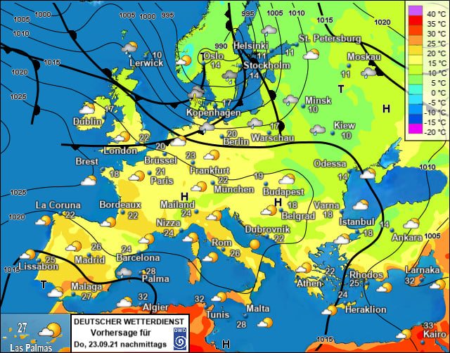 23-го вересня Київ буде найхолоднішою столицею Європи, близько +9 градусів (карта 2). Можливий невеликий дощ, щільна хмарність.