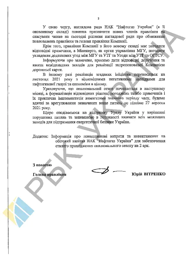 Кроме того, отмечается в письме Витренко, необходимо утвердить основные направления деятельности НАК на 2021 год, проект которого находится на рассмотрении первого вице-премьера Алексея Любченко, утвердить план мер по усилению независимости оператора ГТС и обеспечить заключение договора о получении денег НАК от ОГТСУ на закупку 3 млрд кубометров газа.
